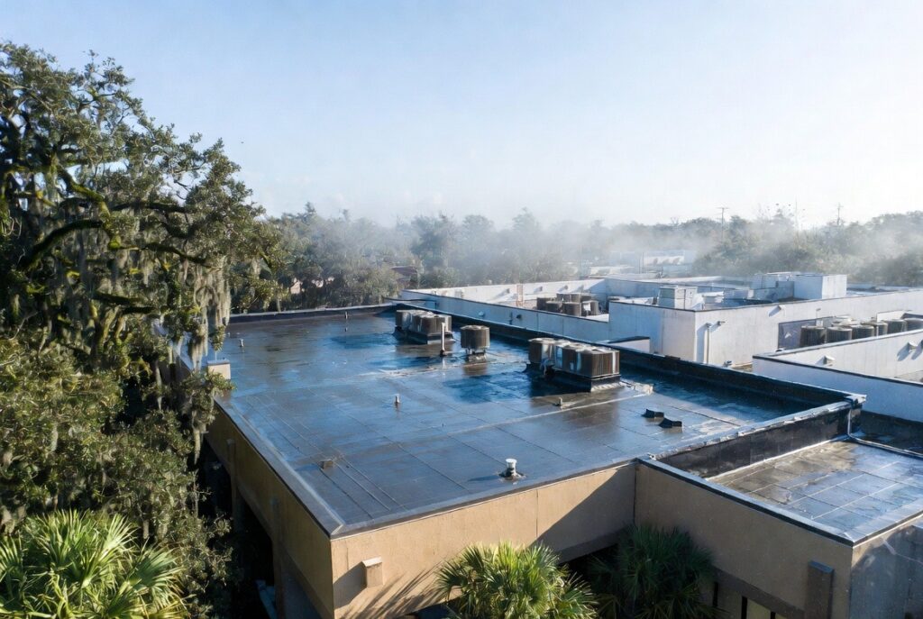 Louisiana’s annual rainfall often exceeds 60 inches, and high humidity keeps surfaces damp longer. These conditions test every seam, penetration, and membrane on a flat roof.