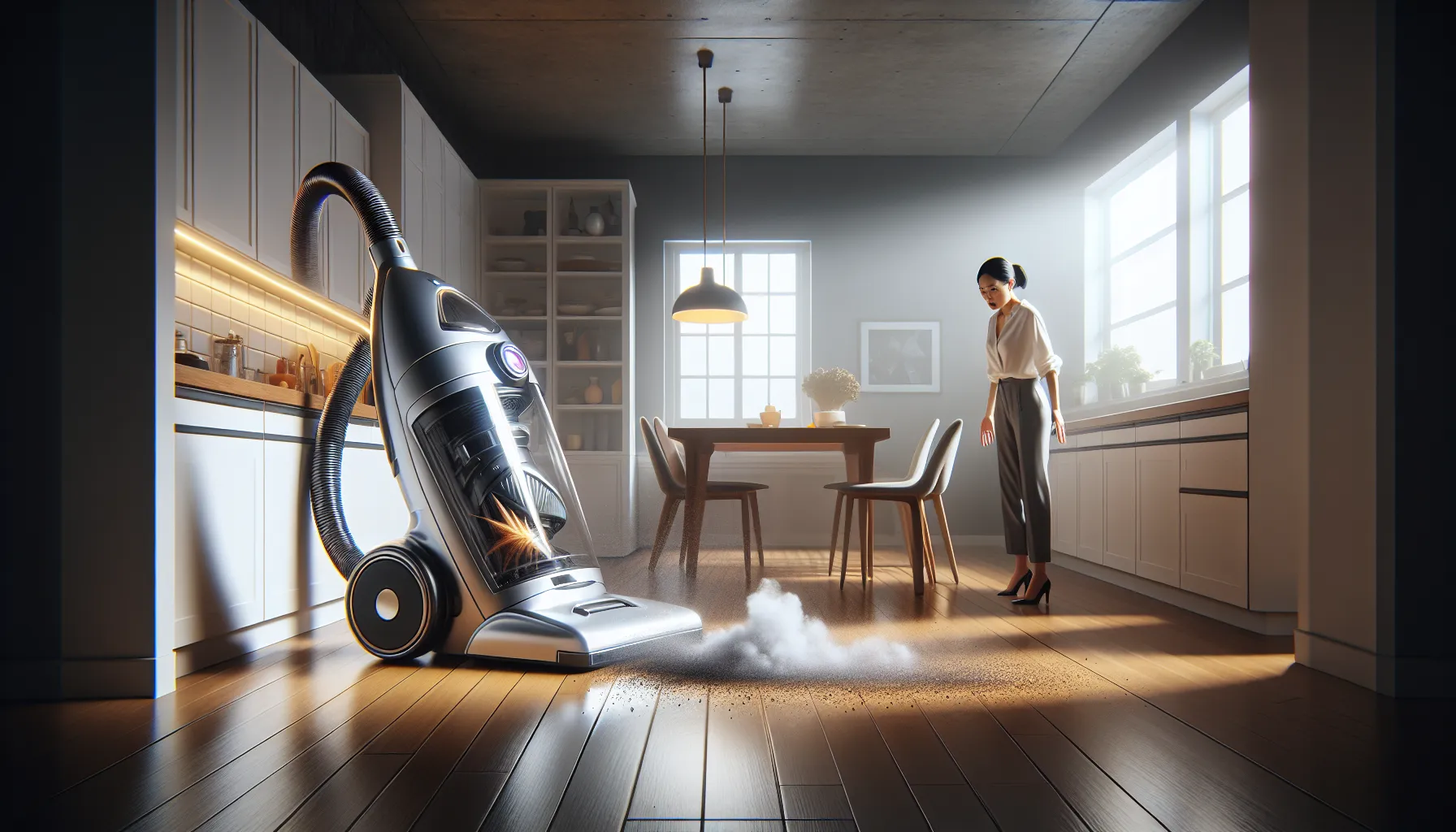 Shark vacuum malfunctioning and spitting out dirt in a modern living room.